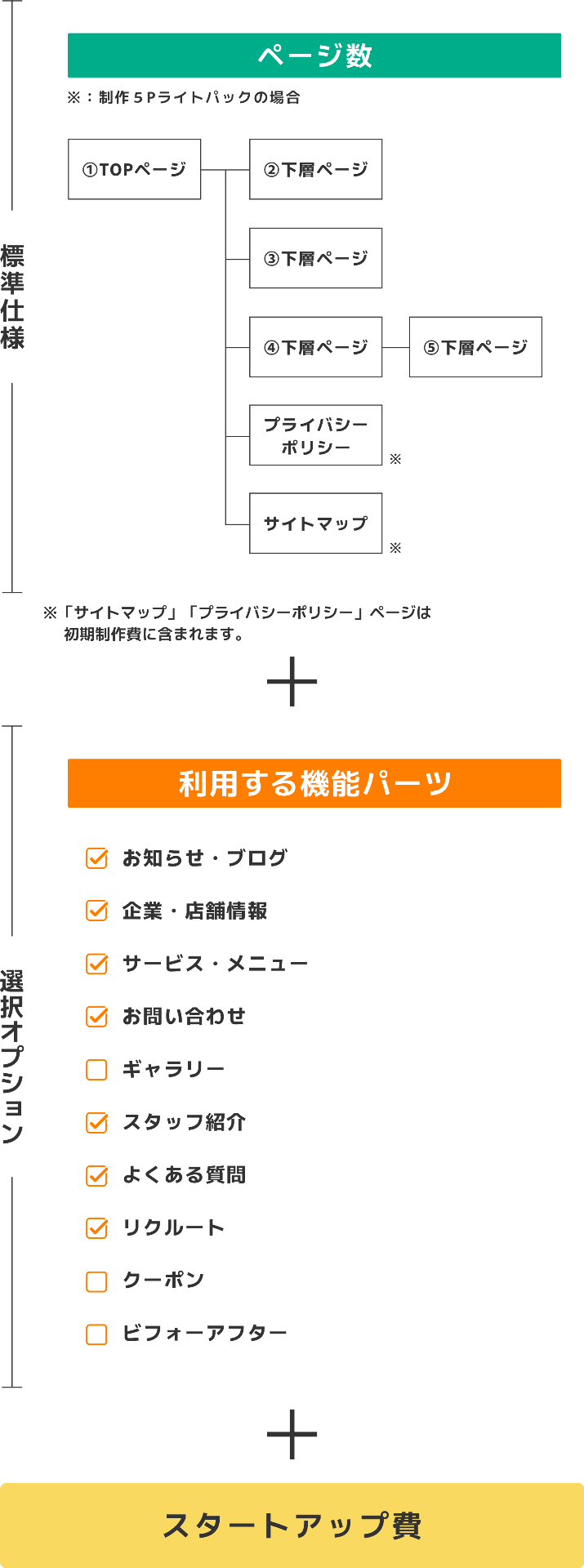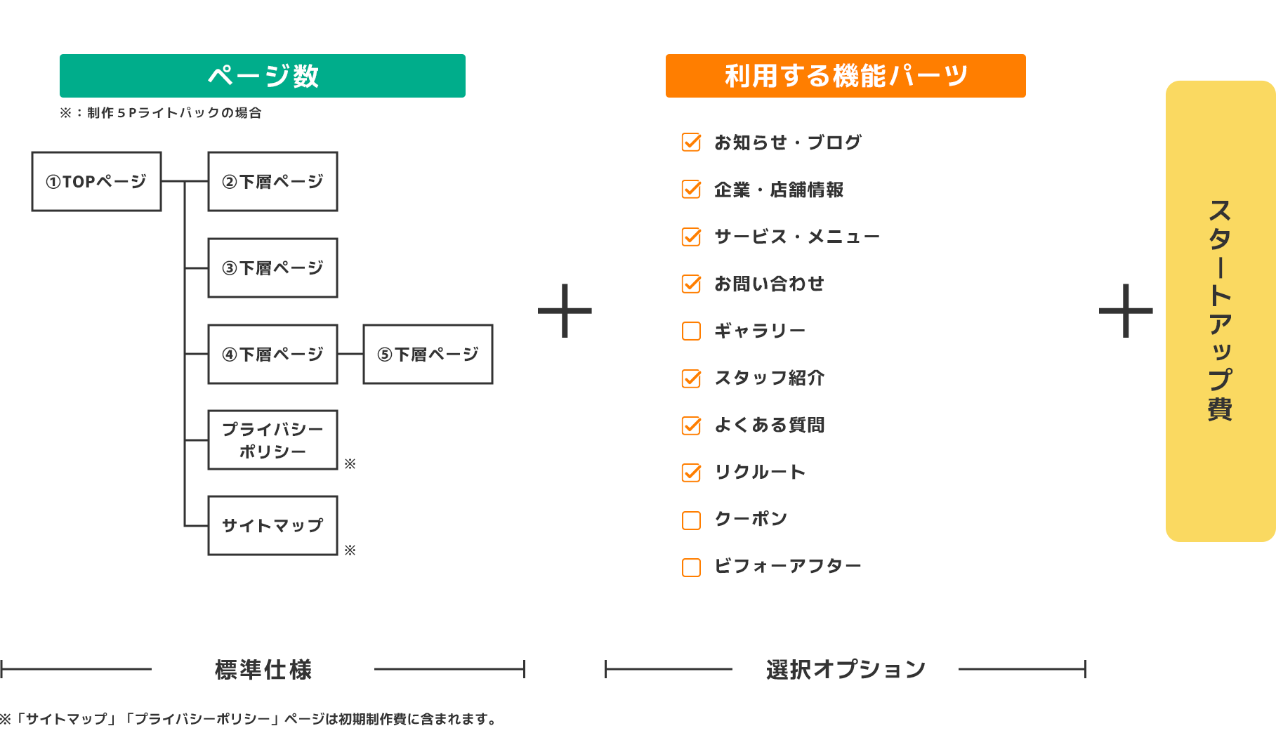 - 「サイトマップ」 「プライバシーポリシー」ページは初期制作費に含まれます。